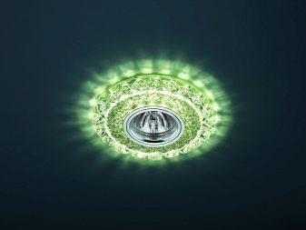 Erwähnenswert sind zweistöckige Decken, die aufgrund der Spotbeleuchtung ein völlig anderes Aussehen erhalten. In dieser Situation wird die Wahl zugunsten von Einbauleuchten getroffen. Sie können jede Ebene oder nur eine davon auswählen.