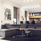 Helles und geräumiges Zimmer. U-förmiges Layout ermöglicht es, alles, was Sie brauchen, erfolgreich zu platzieren. Designer entschieden sich für ein kontrastierendes Duett aus Schwarz und Weiß.