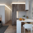 Wenn Sie diese Planungsmethode wählen, ist es zweckmäßig, einen separaten Ort zu erstellen, der aus einem Kühlschrank, einem Herd und einer Spüle besteht. In der Mitte des Raumes platzieren Sie einen Platz zum Essen. Parallel zur Tabelle befindet sich der Arbeitsbereich. Stühle sind auf verschiedenen Seiten platziert. Eine freie Wand kann einen Ruhebereich einrichten.