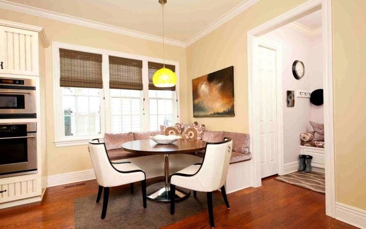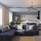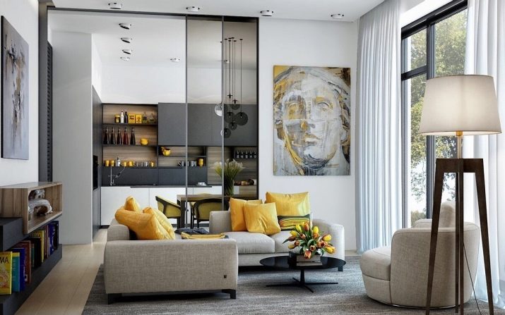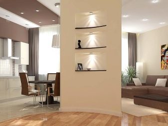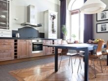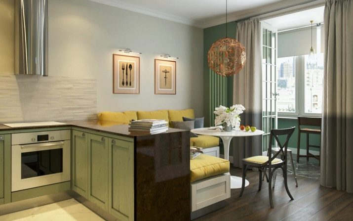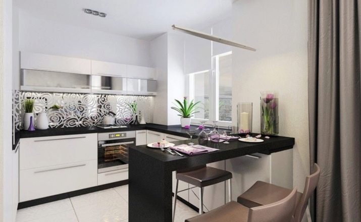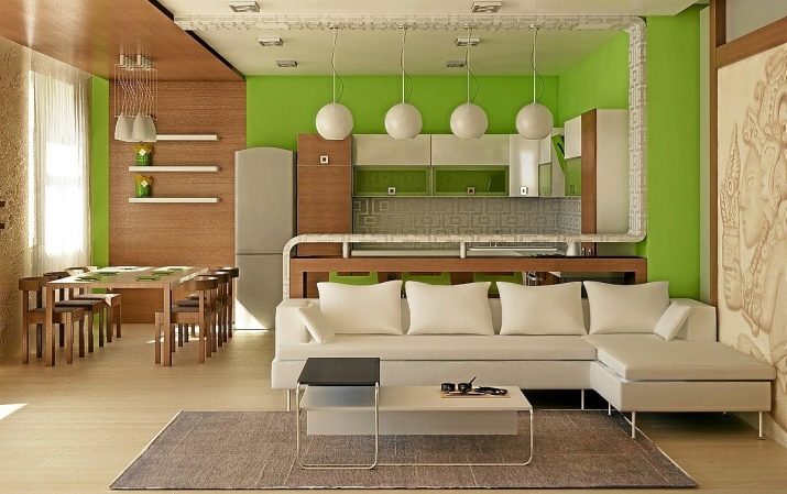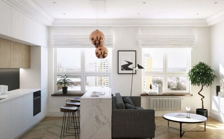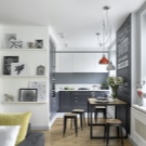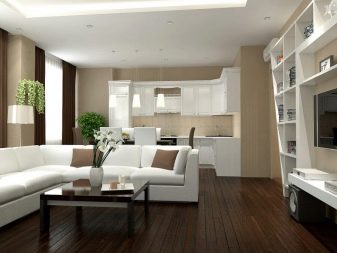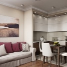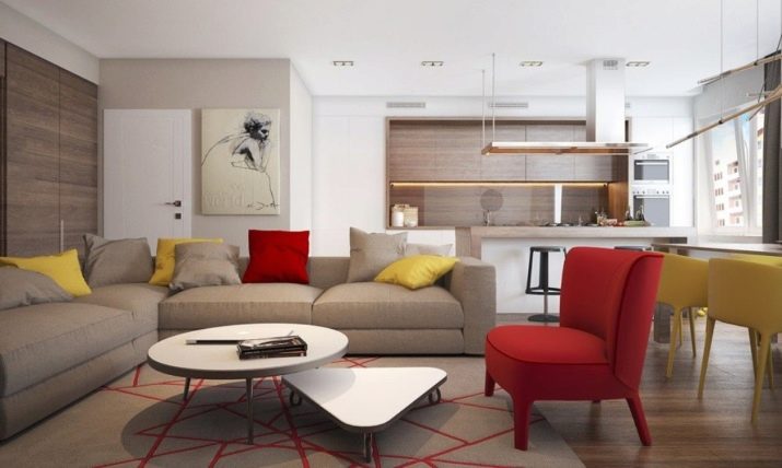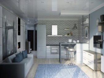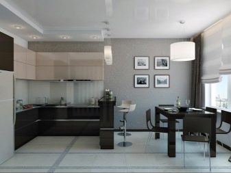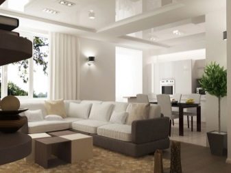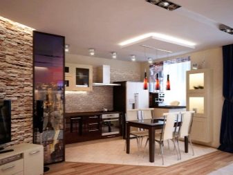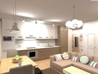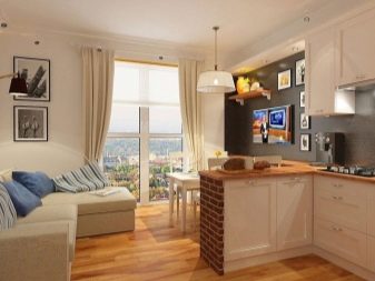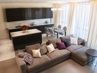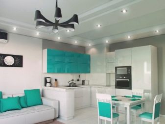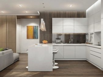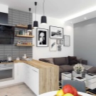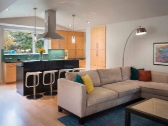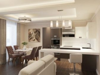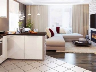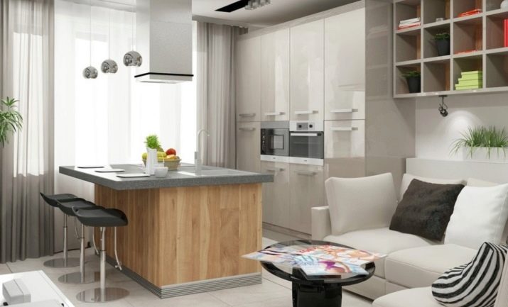 Die mit dem Wohnzimmer kombinierte Küche sollte die Funktionen von zwei Räumen auf der Basis eines Raumes kombinieren. Durch eine gut durchdachte Planung werden komfortable Bedingungen für alle Familienmitglieder und Gäste zu Hause geschaffen.