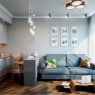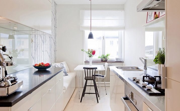 Ein Sofa im Raum macht den überlasteten Raum ausgeglichener. In der Rolle eines Akzents können Sie auch eine Arbeitsplatte in dunkler Farbe verwenden. Dieses Möbelstück hebt sich von den hellen Wänden ab.