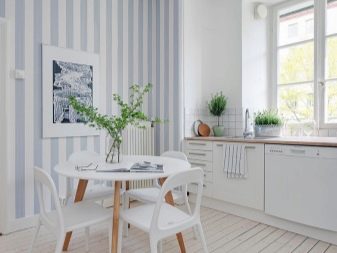 Für diesen Teil des Hauses werden kalte Farbtöne nicht empfohlen. Grau, Blau, Türkis und andere ähnliche Töne in großen Mengen schaffen eine unangenehme Atmosphäre in der Küche. Es wird unangenehm sein, lange drinnen zu bleiben. Kleine und ordentliche Muster helfen dabei, die Grenzen quadratischer Räume zu erweitern. Es ist jedoch unerwünscht, ein solches Design für Küchen mit erweitertem Layout zu verwenden.