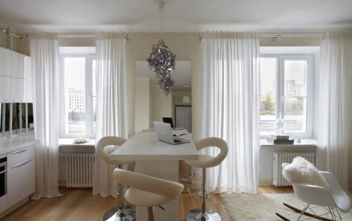 Halten Sie bei der Auswahl von Vorhängen an den Optionen für leichte und durchscheinende Stoffe fest. Lange Vorhänge heben die Decke optisch an. Es wird empfohlen, natürliche Materialien zu verwenden.