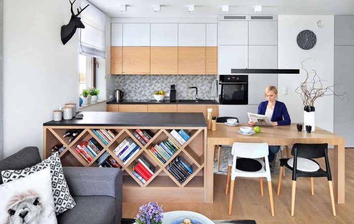 Die Grenze zwischen Wohnzimmer und Küche kann ein eigenständiges Möbelstück sein: Tisch, Blumenständer und andere Optionen.