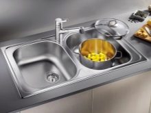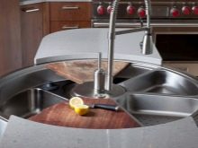 Wenn wir nicht über die Herstellungsmethode sprechen, sondern über die Konfiguration, dann laufen besonders die rechteckigen, runden und Eckspülen mit einer, zwei oder drei Schalen. Zusätzlich zu solchen Armaturen gibt es oft einen „Flügel“, der als Trockner fungiert. Solche Spülen sind viel funktionaler als eine gewöhnliche Schüssel, da sie es ermöglichen, Wasser aus dem Geschirr leicht in die Spüle zurückzulassen und nicht in die Nachttische oder auf die Arbeitsfläche.
