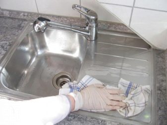 Die Grundregel ist natürlich ständige Pflege. Wenn es versehentlich passiert, ist es viel schwieriger, den ursprünglichen Glanz der Wäsche wiederherzustellen, wenn dies überhaupt möglich ist. Waschen Sie dazu das Waschbecken nach jedem Gebrauch mit warmem Wasser, entfernen Sie Speisereste aus dem Abflussnetz und wischen Sie es trocken. Solche Verfahren ermöglichen es, das Auftreten von Tropfen auf dem Abfluss des Spülbeckens und an seinen Wänden zu verhindern.