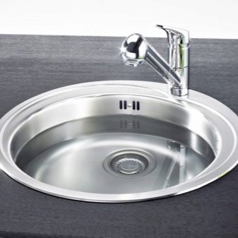 - Rund. Eine Schüssel mit einer ähnlichen Konfiguration ist leicht zu warten, ihr Fassungsvermögen ist viel größer als bei einer rechteckigen Spüle. Die Abmessungen von runden Spülen werden durch Durchmesser gemessen, hauptsächlich 45-51 Zentimeter.