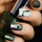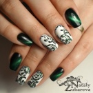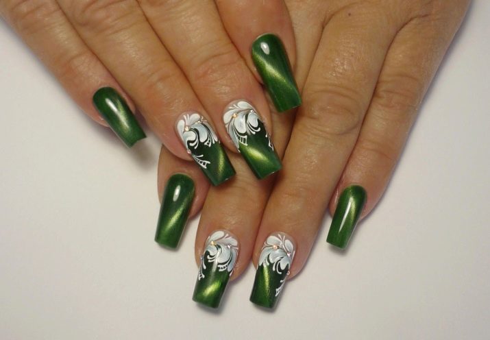 - Das Zeichnen von Hand ist nicht auf Themen und Methoden der Musterausführung beschränkt. Angesichts des dunklen smaragdgrünen Hintergrunds müssen Sie jedoch nach hellen Drucken streben. Ein Muster in einer Farbe, zum Beispiel Weiß oder Silber, sieht auf solchen Nägeln gut aus.