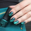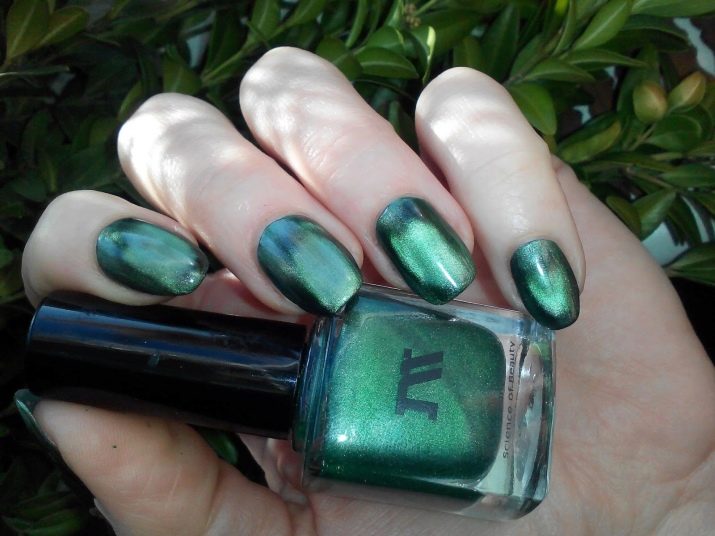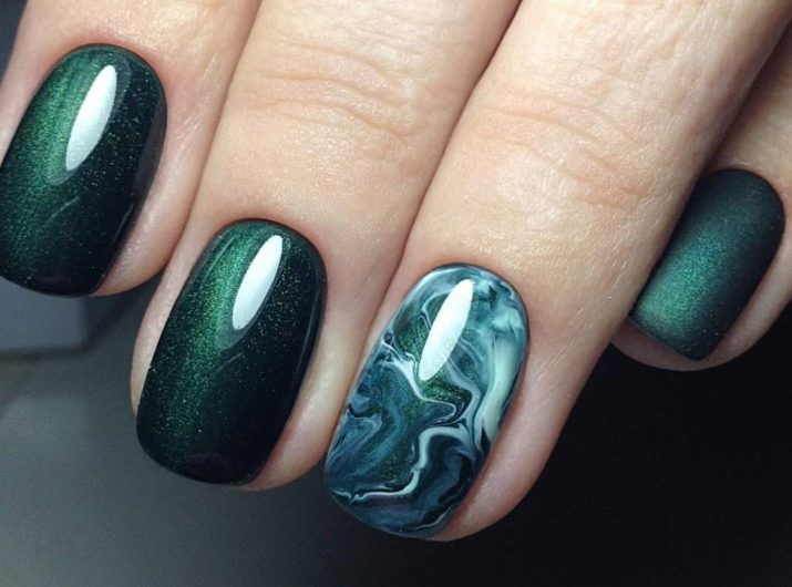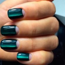 Smaragdfarbe bezieht sich auf die dunklen Töne der Farbpalette. Es dehnt sich gut und verbessert optisch die Nägel, was insbesondere für kurze Nagelplatten gilt. Diese Farbe erfordert jedoch bestimmte Designbeschränkungen, um Adel und Status nicht zu verlieren.