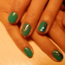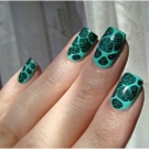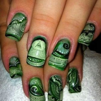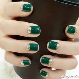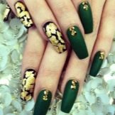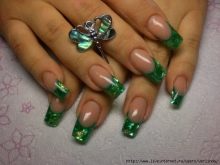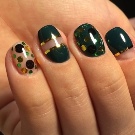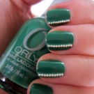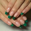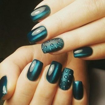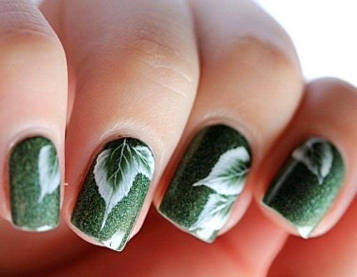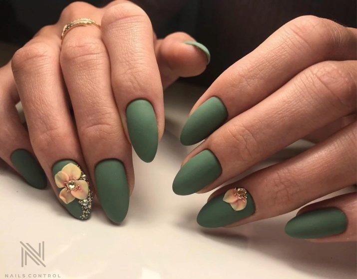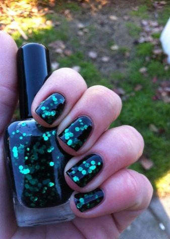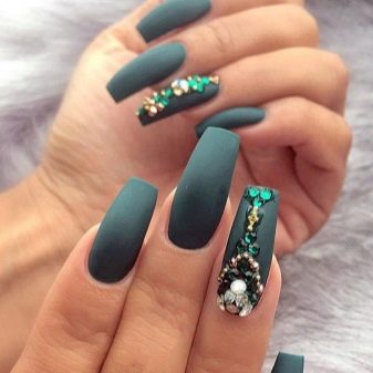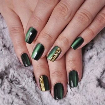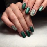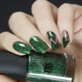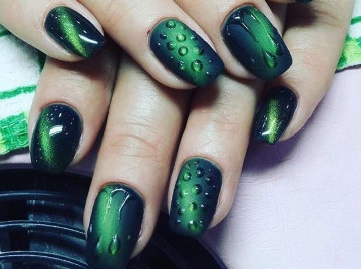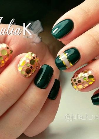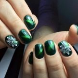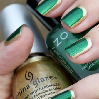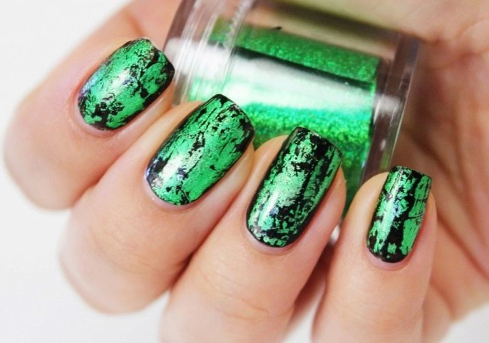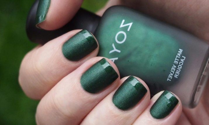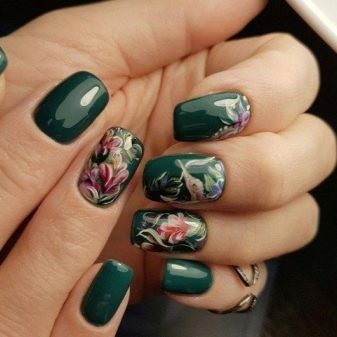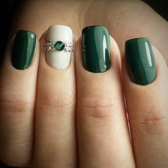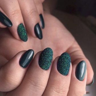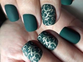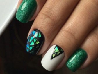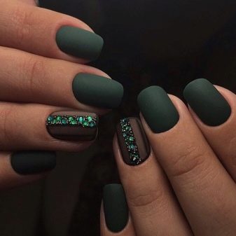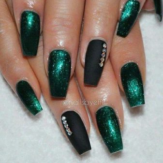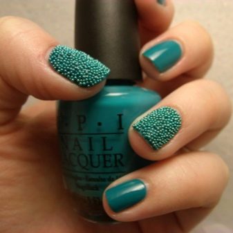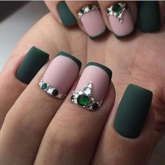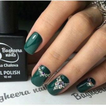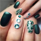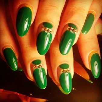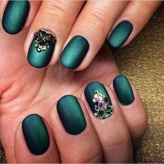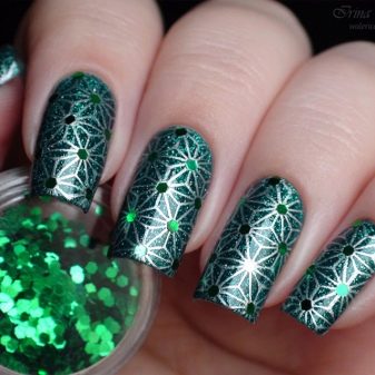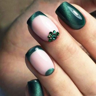Die Elemente der Dekorationsmaniküre sind alle für die smaragdgrüne Farbe geeignet, jedoch mit Vorbehalt hinsichtlich der Notwendigkeit einer Dosierung.