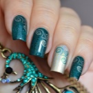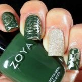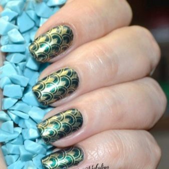 - Stempeln ist eine würdige Alternative zum Malen. In Sekundenschnelle können Sie ein professionelles Bild auf dem Nagel erstellen. Auf einer kontrastierenden Smaragdbasis sieht ein solches Design unabhängig vom ausgewählten Muster stilvoll aus. Das Stempeln ist bequem, und oft können solche Muster mit Strasssteinen verziert werden.