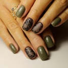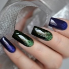 Nun, Maniküre kann heute negativ-räumlich sein. Teilweise unbemalte Platte sieht originell und neu aus, heute ist sie einer der Trends der Modetrends. Die Schleiertechnik ist eine der feinsten, mit einem dunklen Smaragdlack und einem schwarzen Kontrast erweist sie sich als besonders weiblich. Glasscherben werden mit einem speziellen Film als Schwerpunkt auf ein oder zwei Nägeln hergestellt. Die Verwendung von Pulver ist insofern bemerkenswert, als Sie damit die Textur des Haupthintergrunds hervorheben können.
