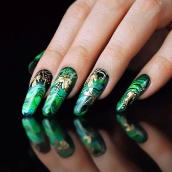 Smaragd-Maniküre kann mit verschiedenen Designtechniken durchgeführt werden. Mit jedem von ihnen können Sie ein spektakuläres Design kreieren, das die begeisterten Looks anderer anzieht. Die Techniken sind auch insofern einzigartig, als sie ergänzt und kombiniert werden können. Vor dem Hintergrund eines Überlaufs von Tönen können Sie also ein Design mit Löchern oder einem Konturstrich der Nagelplatte ausführen.