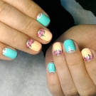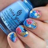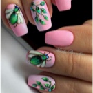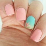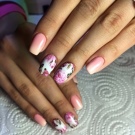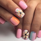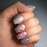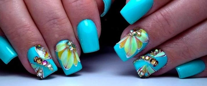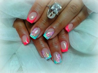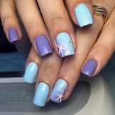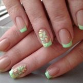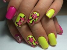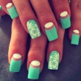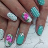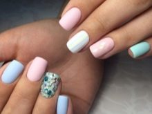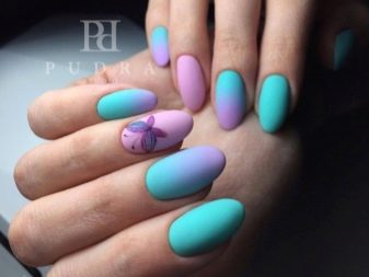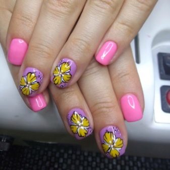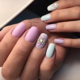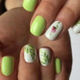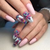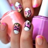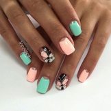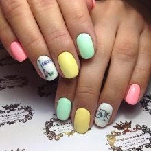 Auf kurzen runden Nägeln werden Zeichnungen in Form tropischer Schmetterlinge ausgeführt. Sehr relevant sind auch Blumendrucke auf einem zarten weißen oder milchigen Hintergrund. Die Feng Shui Maniküre hat sich verändert. Jetzt ist nicht nur der Ringfinger in einer anderen Farbe lackiert. Jeder Finger an der Hand kann in kontrastierenden Farben gemalt werden. Besonders saftig in dieser Technik sieht sauber aus und zarte Minz-, Gelb-, Rosa- und Blautöne.