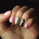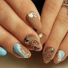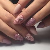 Süße Blüte ist eine weitere Neuheit in diesem Sommer. Die schwierigsten Optionen werden von Maniküre-Meistern ausgeführt. Einfache Ornamente können unabhängig voneinander geübt werden. Die Beschichtung sieht aufgrund mehrerer Vorteile gleichzeitig sehr beeindruckend aus: saftig saubere Farbtöne, eine Vielzahl von Farben und Zeichnungen, volumetrisches Design. Die Zeichnung erinnert etwas an Buntglas auf dem Glas mittelalterlicher Schlösser und enthält gleichzeitig oft klassische orientalische Ornamente und Blumenmuster. Das Ornament wird oft mit einer kleinen Anzahl von Strasssteinen ergänzt. Liebhaber von zarten Pulvertönen werden auch die modische Neuheit zu schätzen wissen. In sanften Cremefarben sieht dieses Design auch attraktiv aus.