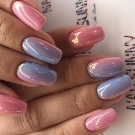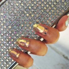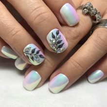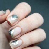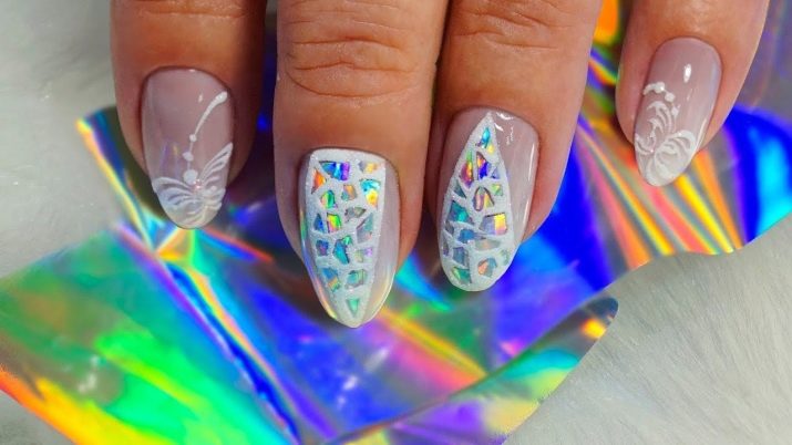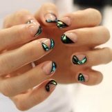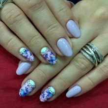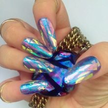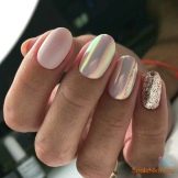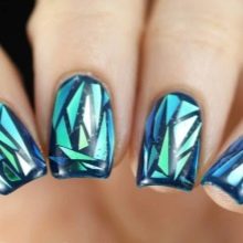 Maniküre "Glasscherben" oder "Spiegel" (in Folienversion) wird oft in Kombination mit einem anderen Gemälde auf einem Nagel verwendet. Dieses Design überlagert zarte Perlenfarben, einen metallischen Farbverlauf oder ein geometrisches Stilmuster.