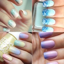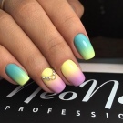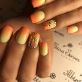Die Gradientenfärbung in der Sommersaison erfreut sich weiterhin mit frischen saftigen Nuancen. Dies ist nicht nur der traditionelle glatte Übergang von einem Farbton zum anderen auf einer Nagelplatte in horizontaler oder vertikaler Richtung, sondern auch der Übergang von Nagel zu Nagel. Es gab Trends in der Komplexität der Gradiententechnologie. Die Farben sind tiefer geworden, Überläufe werden durch Funkeln ergänzt. Auf den Nägeln befindet sich eine Vielzahl von Dekorationen, die aus anderen Techniken entlehnt wurden. Ombre passt gut zu Glasscherben, Brühen, Tautropfen, Blumen und Beeren, die mit einem oder zwei Fingern gezeichnet werden.