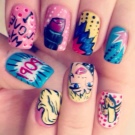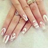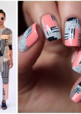 Der Art-Deco-Stil verkörpert sich im Nageldesign. Fühlen Sie sich frei, stilisierte Striche, Bilder, Symbole auszuführen. Es ist nicht erforderlich, Blumensträuße oder Landschaften auf die Nägel zu zeichnen, um stilvoll auszusehen. Die Massenkultur zieht sich zu Symbolen oder halben Hinweisen hin. Die Maniküre kann Helden populärer Filme, Symbole der beliebtesten Ereignisse (wie Weltmeisterschaften oder Olympische Spiele) enthalten.