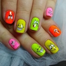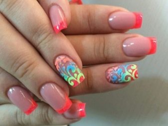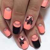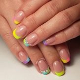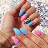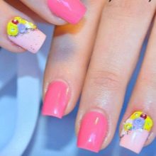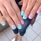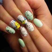 Die Kombination von Farben und Ausführungstechniken ist mittlerweile sehr vielfältig - von klassisch bis modisch avantgardistisch. Alle Arten der klassischen Maniküre erhielten im Sommer ausnahmslos einen neuen Klang und eine neue Verkörperung in satten Farbtönen, weshalb sie auch für sehr junge Mädchen geeignet sind. Ein fröhlicher Druck mit Tupfen, Lieblingsfiguren der Animation, traditionelle Symbole des Sommers schaffen eine fröhliche Stimmung. Sie können jedoch auf den Nägeln auch ziemlich erwachsener junger Damen als Akzente an mehreren Fingern vorhanden sein.