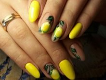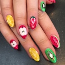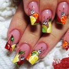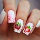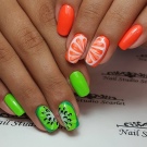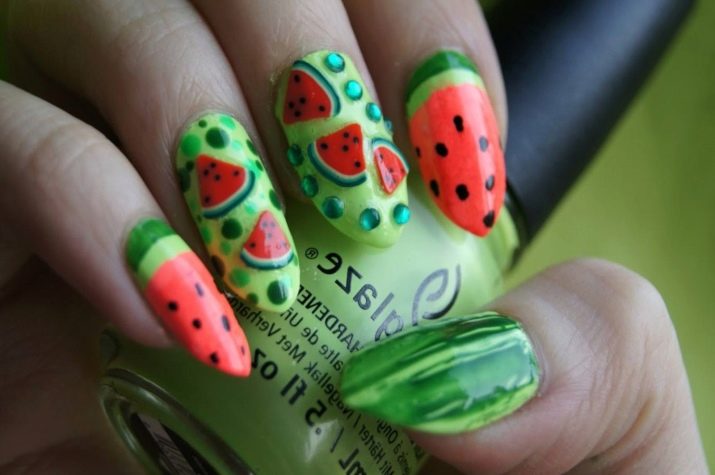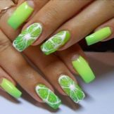 Ein beliebtes Sommermuster mit Früchten und Beeren wird durch eine Technik ergänzt, die Regentropfen oder Tau simuliert. Sie können selbst erstaunliche Maniküre machen. Helle saftige Früchte betonen gebräunte Finger wunderschön. Wassermelonen, Kiwi, Orangen, Erdbeeren, Passionsfrüchte werden in den Zeichnungen der Aufkleber voluminös hergestellt. Mit ihrer Hilfe können Sie ein spektakuläres Design erstellen. Tropfen auf den Nägeln erzeugen ein zusätzliches Gefühl von Frische und Natürlichkeit der Frucht. Sie werden mit dem üblichen Decklack ausgeführt.