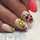 Nicht nur prächtige Schmetterlinge, sondern auch andere helle Insekten können sich auf Ihren Nägeln niederlassen, es sei denn, Sie fühlen sich dieser Fauna natürlich feindlich gesinnt. Tropische Regenbogenkäfer, Heuschrecken und Marienkäfer sehen inbrünstig aus und erinnern an eine unbeschwerte Kindheit und einen unbeschwerten Sommer mit meiner Großmutter im Dorf. Dieses Muster kann mit Strasssteinen an den Flügeln und anstelle der Augen von seltsamen Käfern und Libellen ergänzt werden.