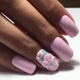 - Das matte Finish hat es nicht eilig, die Top-Maniküre-Designoptionen zu verlassen. Neben dem feinen Schleifen sieht es besonders sanft aus. Wenn in der Wintersaison eine matte Maniküre hauptsächlich in einem monochromen Design oder abwechselnd mit einem glänzenden Finish durchgeführt wurde, wobei das Metall im gleichen Ton reibt, werden jetzt Akzentnägel mit einem reichen Blumenmuster verziert. Die Samtbeschichtung von Monophonic selbst wurde hell und sogar mit der Technik des Aufbringens des Gradienten kombiniert.
