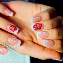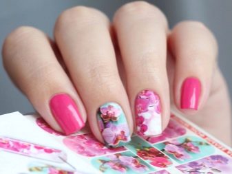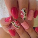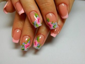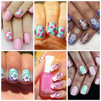 Helle Kleider und Sommerkleider ergänzen eine Maniküre erfolgreich mit Blumenmotiven: tropisches Grün, luxuriöse Iris und Rosen, ausgefallener Hibiskus und Lilien. Das Blumenzeichnen kann mit einem Pinsel durchgeführt werden, wenn genügend Erfahrung vorhanden ist. Wenn die Zeit knapp ist, können Sie die Nägel mit thematischen Aufklebern dekorieren. Profis machen 3D-Bildhauerei oder Musterung.