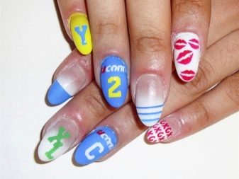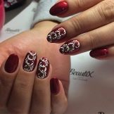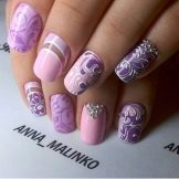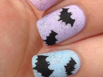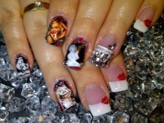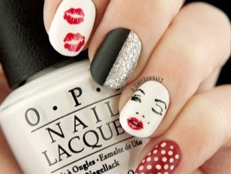 Das thematische Nageldesign wird in der Mode für verschiedene Feiertage und Partys verwendet. Für einen Buffetempfang im Stil der goldenen 1920er Jahre eignen sich interessante Versionen einer Jacke mit Netz, eine Fülle eleganter Strasssteine. Geister und eine Fledermaus in verschiedenen Versionen eignen sich für Partys im gotischen Stil und "Gangster" -Events. Gute Optionen für einen Urlaub im Stil der 60er Jahre: Tupfenmaniküre, rosa Nägel, Bilder von Marilyn Monroe und andere Diven jener Jahre auf Nägeln.