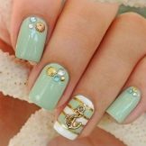 Wenn Sie in den Urlaub fahren, können Sie eine praktische Maniküre durchführen, die die Bräune wunderschön betont. Dazu benötigen Sie einen Minz- oder Milchüberzug. Diese Option eignet sich für jedes Kleid oder Badeanzug. Eine Maniküre mit Steinen oder Strasssteinen sieht gut aus. Der Sommer ist jedoch die Zeit für mutige Experimente. Es ist eine Sünde, diese Gelegenheit nicht zu nutzen und keine thematische Meeresmaniküre durchzuführen.