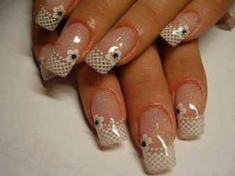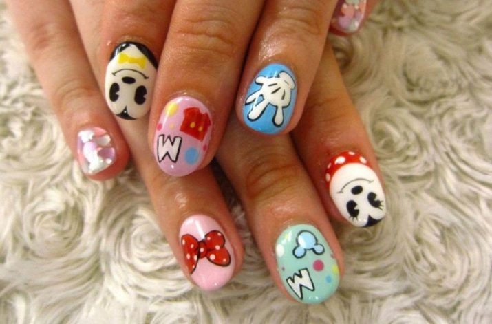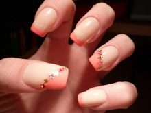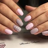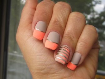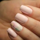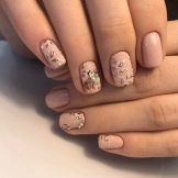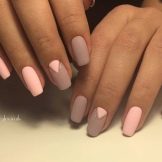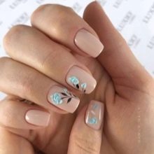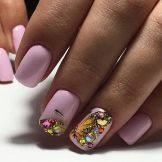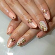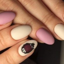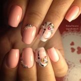 Kleine natürliche Nägel können mit Nude-Tönen in Kombination mit einem velourmatten Finish erfolgreich betont werden. Zarte voluminöse Zeichnungen verleihen nur Charme. Und die Abendversion der Maniküre kann mit Gold oder Strasssteinen auf der Lunula ergänzt werden. Junge Mädchen schmücken ihre Nägel oft mit Aufklebern mit lustigen Zeichnungen in Form von Cartoons, Tieren und Liebessymbolen. Auf kurzen, sauberen Nägeln sieht es gut und besonders harmonisch aus.