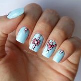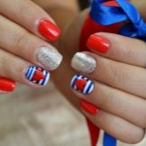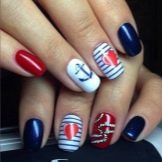 Die Klassiker der Sommerferienstimmung verkörpern sich in einem blau-weiß-roten Farbschema. Streifen der Matrosennägel eines Seemanns werden erfolgreich mit Brühen und anderen kleinen Elementen mit Vergoldung ergänzt. Es kann ein Helm oder ein Anker sein.