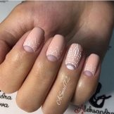 Eine ruhige Maniküre mit einer transparenten Beschichtung im Stil einer französischen oder Mondoption passt universell zu jedem Outfit. Ein interessanter Effekt wird zusätzlich durch verschiedene Muster und Muster am Akzentfinger ergänzt. So kann die Maniküre ziemlich oft geändert werden, buchstäblich auf die Farbe und den Stil jedes Kleides.