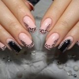 Eine beliebte Kombination aus Beige und Schwarz sowie Hellrosa und Schwarz. Diese Kombination erinnert an die Zärtlichkeit und Erotik von Spitzenunterwäsche. Zeichnungen werden mit dünnen schwarzen Linien in Form von Abstraktionen, Spitzen oder Zweigen gemacht.