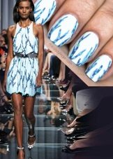 - Die Nuance der Saison, die sich in verschiedenen Techniken wiederholte, war der Akzent mit reichem Dekor an zwei Fingern. Gleichzeitig ist der Rest eher bescheiden in einem Ton gemalt oder kann Echos des Hauptdesigns haben.