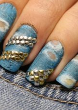 Junge Denimliebhaber sind eingeladen, eine Zeichnung im gleichen Stil zu machen. Besonders beliebt ist die Nachahmung von zerrissenen Jeans auf Nägeln. Mit moderner Jugendkleidung im Sportstil passt die zurückhaltende Maniküre auf kurzen Nägeln gut zusammen. Mit einem matten Finish in Pink und hellen Kaffeetönen verleiht es der verspielten und zarten Weiblichkeit einen entspannten Look.