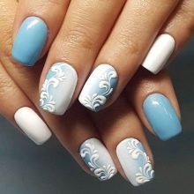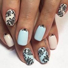 Beliebte Monogramme sind heute auch in ihrer reinen Form selten. Sie können als Betonung auf einem oder zwei Nägeln in einer Jacke oder einem Farbverlauf dienen. Oft erhalten Locken zusätzliches Volumen und werden selbst mit glatten Übergängen bemalt, wobei sich der Farbverlauf auf der Basis wiederholt. Wie andere Maloptionen werden sie in bizarren und ungewöhnlichen Kombinationen mit anderen Techniken verwendet. In der Sommermaniküre verwandeln sich Monogramme in orientalische Gurken und bilden dann ein Muster, das der indischen Malerei mit Henna Mehendi ähnelt. Es gibt keine Verbote, um die gewagtesten Ideen im sommerlichen Nageldesign zu verkörpern.