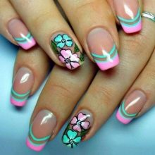 Anhänger der Klassiker sollten ihre Aufmerksamkeit auf eine gepflegte French Manicure lenkenDas ist sehr beliebt in dieser Saison. Sie können es zu einer klassischen Version oder zu einer der angesagtesten Sorten machen.Bei der Ausführung einer Jacke wird die Lunula häufig isoliert und ein traditioneller weißer Streifen mit leuchtenden Farben bemalt: Rot, Minze, Orange, Zitrone. Die Sommersaison erlaubt dies, Hauptsache, die Farben sind frei von Verunreinigungen. Die moderne Jacke wird durch Spitzen und Strasssteine sowie üppige Blumen ergänzt. Die Hauptsache ist, sich bei der Auswahl der Akzente an die Proportionen zu erinnern. Dann verwandelt sich die gewöhnlichste Tagesservicejacke in eine originelle und positive Sommermaniküre.