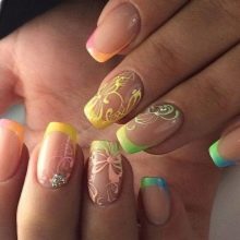 Die Sommer-Nacktmaniküre blieb genauso elegant und zart. Er erwarb jedoch Elemente des Sommerdesigns. Glänzende Metallstreifen verstärken die Reflexionen der Sonne auf den Nägeln. Strasssteine und Blumen sorgen für Eleganz und Weiblichkeit. Die Farbtöne sind reicher und vielfältiger geworden und wiederholen die Töne von Sommerfrüchten und Früchten.