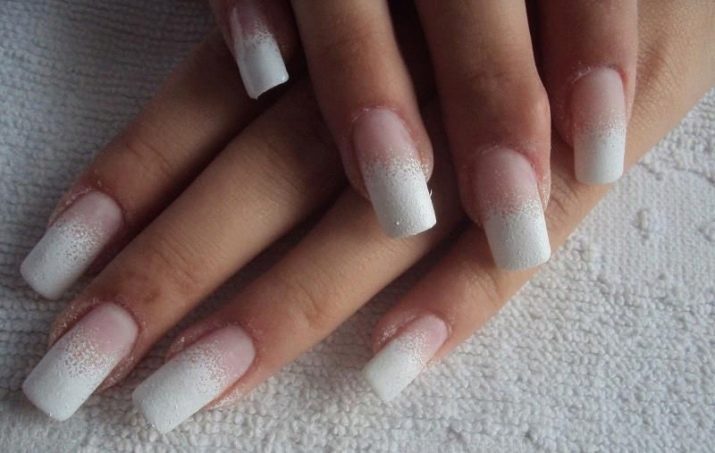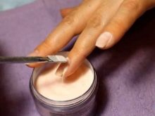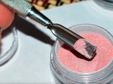 Acrylpulver mit transparentem Matt-Effekt ist sehr einfach zu verwenden und kann daher problemlos zu Hause verwendet werden. Diese Beschichtung wird auch Samtsand genannt. Es wird wirtschaftlich verbraucht und ist relativ kostengünstig. Acrylpulver wird ausschließlich mit Gel-Maniküre verwendet und auf eine unverarbeitete Oberseite aufgetragen. In dieser Form werden die Nägel in eine Lampe gelegt, getrocknet und dann die Reste des Pulvers entfernt. Das Ergebnis ist wunderschön.