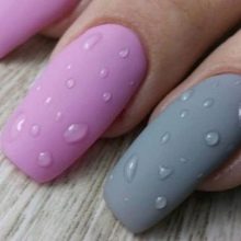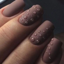 - Vor einem matten Hintergrund sind glänzende Tropfen eines Tops auch eine einfache Idee, die je nach Wahl der Hauptfarbe unterschiedlich aussieht. Von einem solchen Design weht Frische, leichte Originalität, die an Eleganz grenzt. Für eine solche Maniküre wird es sicherlich Zeit und Stimmung geben.
