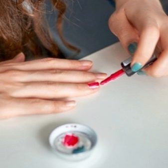 - Tragen Sie Lack auf den vorbereiteten und bearbeiteten Nagel auf (der mittlere Teil wird zuerst gestrichen, und dann werden die Seitenbereiche abgedeckt).
