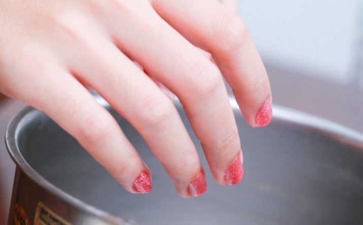 - Bis der Lack getrocknet ist, platzieren Sie den Nagel mit heißem Wasser über dem Behälter, aber nicht sehr nahe, um keine Verbrennungen zu bekommen.