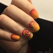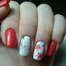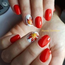 - Wenn Sie sich für eine Maniküre für den 1. September entscheiden, vergessen Sie nicht das saisonale Thema. Sehr praktisch wird eine Maniküre mit dem Bild von Herbstlaub und Blumen haben. Die Hauptsache ist, sich an Zurückhaltung zu erinnern und sie nicht zu hell zu machen. Es reicht aus, einen Nagel mit einem hellen Ahornblatt oder einer Rosenblüte zu dekorieren, und eine langweilige, zurückhaltende Maniküre wird mit neuen Farben funkeln.