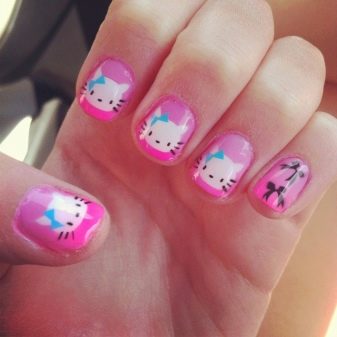 Maniküre-Designs für High-School-Mädchen können sehr unterschiedlich sein, aber vergessen Sie nicht, dass Maniküre für die Schule nicht zu provokativ sein sollte. Es lohnt sich, die Auswahl an zarten Farbtönen zu unterbinden. Auf den Nägeln junger Schönheiten sind Zeichnungen angebracht, die auf Ihren Lieblings-Cartoons wie „Hello Kitty“ oder „My Little Ponies“ basieren.