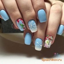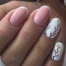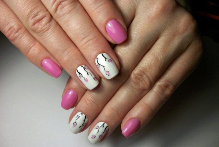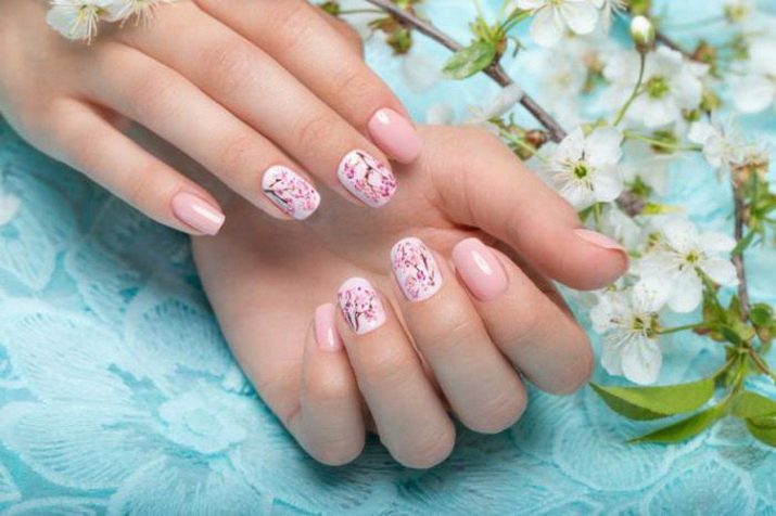Frühlingsmaniküre ist in erster Linie Pflanzenmotive, Blumenmuster. In der Regel wird an mehreren Fingern gemalt, der Rest ist mit einem monochromen Farbschema von zarter Farbe bedeckt.