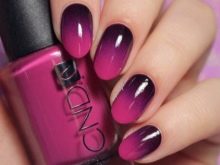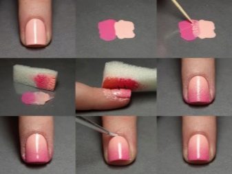 Es ist möglich, den Farbverlauf folgendermaßen durchzuführen: Tragen Sie verschiedene Lackstreifen so auf Papier auf, dass sie sich etwas überlappen. Dieser Vorgang erfolgt so schnell wie möglich, damit die Beschichtung keine Zeit zum Trocknen hat. Drücken Sie den feinporigen Schwamm auf die resultierende Farbe und dann auf den Nagel. Das Ergebnis ist ein originelles Design.