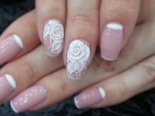 Festliche Maniküre kann mit Perlen, Folie und alltäglicher Maniküre in hellen Farben (blassrosa, Sand, Kaffee, Schneewittchen) dekoriert werden.