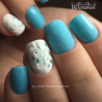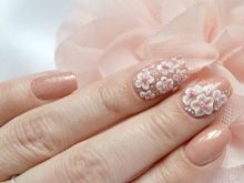 Die Verwendung volumetrischer Elemente bei der Gestaltung von Nägeln verleiht der gesamten Maniküre ein Highlight. Das Nageldesign in Form von Pullovern, volumetrischen Rosen, Spitzen, Monogrammen, unter der Haut von Reptilien, mit Brühen und einer Mikrokügelchen kann unabhängig voneinander durchgeführt werden. Darüber hinaus können Ringelblumen mit Strasssteinen, Spitzen, Samtsand, Bändern, Glitzer, Netz, Perlmuttkieseln und anderen Elementen verziert werden.