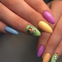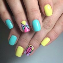 Sommermaniküre kann sehr hell und saftig sein oder umgekehrt sinnlich, zart, weiblich. Es ist völlig optional, Nägel so zu gestalten, dass sie der Farbe Ihrer Garderobe entsprechen. Neue Stiltrends akzeptieren eine Kombination verschiedener Farben im Design von Nägeln und in Kleidung.