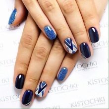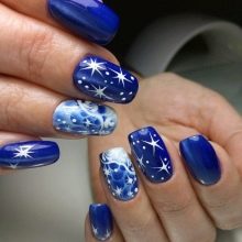 Die besten Farben für die Wintermaniküre sind Blau, Tiefblau, Burgund, Scharlach, Smaragd. Auch Pastellfarben sind relevant. Das Dekor verwendet Muster und thematische Zeichnungen zu einem Winterthema sowie Strasssteine und Pailletten.